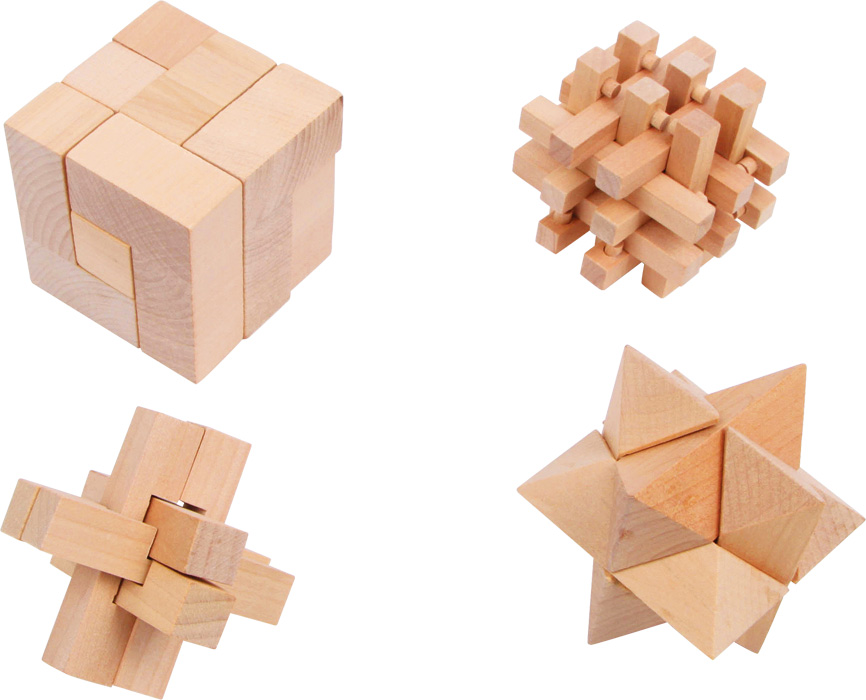 - die vier aus verschiedenen Holzteilen bestehenden Körper gilt es wieder in ihre Ursprungsform zusammenzusetzen