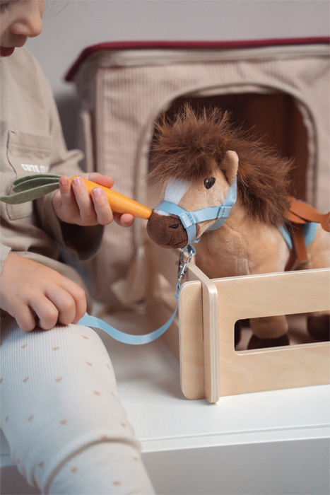 - inkl. Karotte und Heunetz zur Fütterung des Plüschpferdes