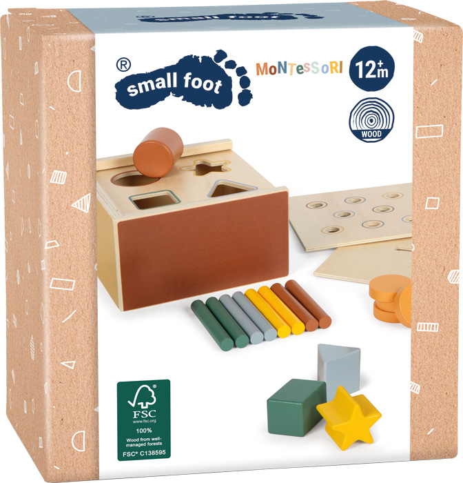 Discovering, matching, understanding - this Montessori shape-fitting game made of FSC® 100%-certified wood offers toddlers an exciting opportunity to learn by doing. The robust wooden box with three interchangeable inserts places different demands on coordination and logical thinking: whether inserting coins, inserting rods or matching geometric shapes - each inserting game specifically trains motor skills and supports the recognition of shapes and colours. The soft colours and clear structure specifically support concentration, focus and problem solving. The Montessori-inspired design also motivates children to discover independently and supports important developmental steps.