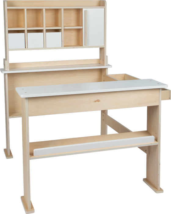 La boutique parfaite pour les petits vendeurs ! Ce stand de vente en bois naturel combiné à un blanc sobre marque des points grâce à son grand comptoir de vente et beaucoup d’espace de rangement. Des détails bien pensés, tels que trois tiroirs pratiques pour les petits articles, un compartiment latéral et une porte coulissante dans l'étagère de vente arrière, assurent un bon aperçu pendant le jeu et un espace de rangement supplémentaire pour les marchandises et les accessoires. La construction stable garantit la stabilité, ce qui permet de vendre et de marchander pendant des heures – attire tous les regards dans la chambre d'enfant !