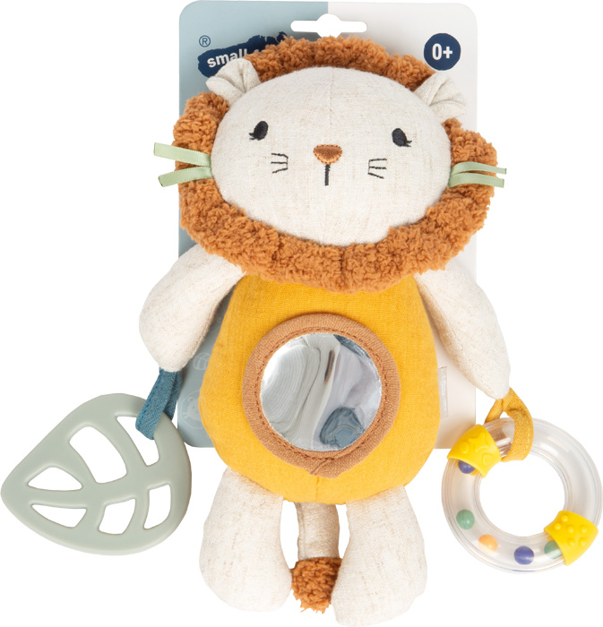 Product informationFeel, grasp and discover! The cuddly suspended figure Little Lion is a versatile accompaniment for babies and young children – with a teething ring, rattle and various fabric structures, it provides sensual experience and playful support. Thanks to practical suspension, the small fabric animal can be attached everywhere – to the pram, the infant carrier or the toy bar. The soft muslin fabric, the cute lion’s face and the cuddly haptics make the babies’ toy a faithful companion in everyday life.