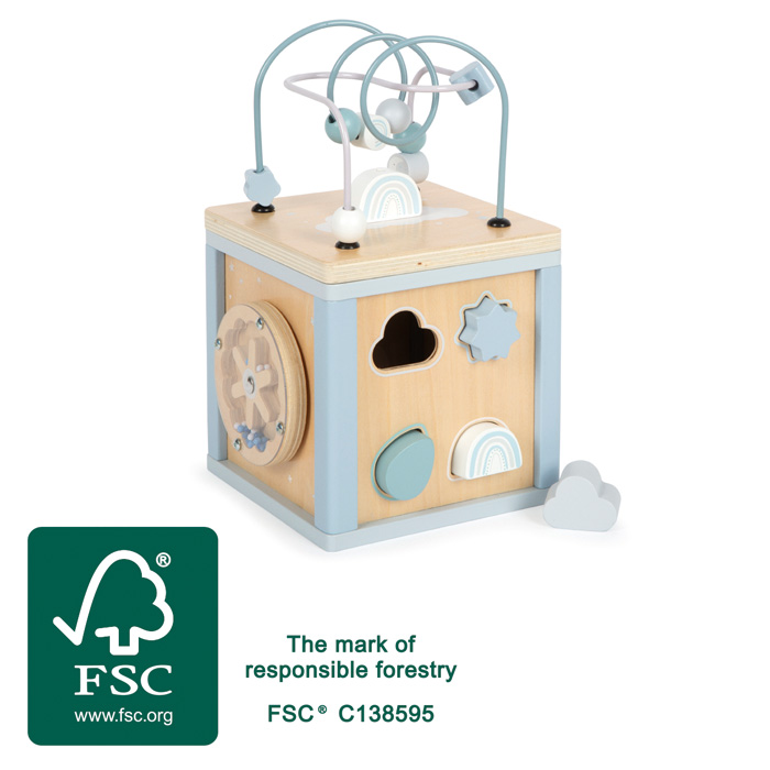 A cube full of options! This lovingly designed motor skills cube made of FSC® 100%-certified wood combines five exciting playing areas in soft pastel shades with diverse playing and learning options. Here, motor skills loops, shape insertion game, cog wheels, sliding maze and rattle wheel invite to playful moments rich in variety and support fine motor skills and dexterity in a playful manner as well as the recognition of shapes and colours. Rounded-off edges and high-quality workmanship make the cube not only a safe learning toy, but also a decorative eye-catcher in the child’s room. The cover can be removed and stored with minimum space requirement in the cube – perfect for people who love tidiness.