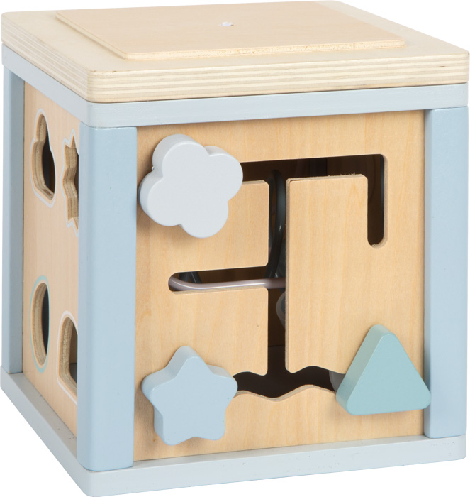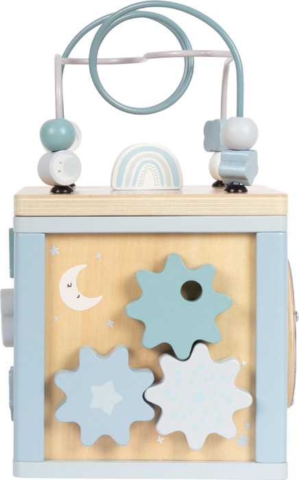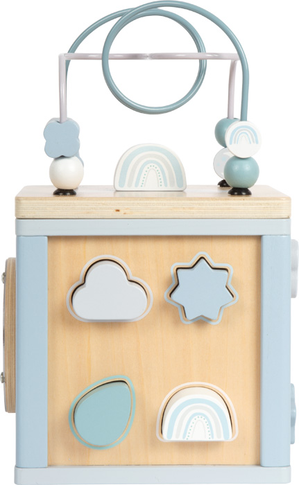 The motor skills cube provides children of 12 months and older a varied combination of learning and playing options. When inserting, rotating, sliding and threading, the coordination of the hand and eyes, logical thinking and creativity are supported. The different activities – from the motor skills loop to the rattle wheel – address different senses and ensure long-lasting fun when playing. The child-friendly design with soft blue shades and untreated wood make the cube a timeless toy, which is both pedagogically valuable and visually appealing. Robust materials and carefully rounded off edges ensure a safe playing experience.