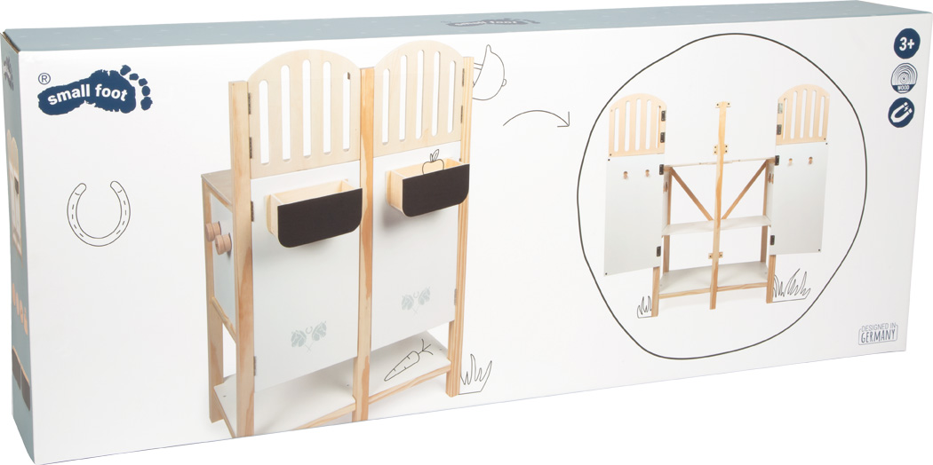 Two boxes for little horse fans! The Hobby Horse stable, which is rich in detail and consists of stable wood, provides space for two Hobby Horses and impresses with lovingly designed details and equipment which leaves no wishes open: The removable feeding toughs are equipped with blackboard surfaces and can be labelled individually – also ideal as box signs Depending on the requirements, the removable bridle holders can be positioned at the front or the side or exchanged with the feeding troughs..Thanks to magnetic latches, the box doors and windows can be opened individually – making playing even more realistic. The insertion shelf for the Hobby Horses has two different insertion options for the horsies, thus making various game scenarios possible. With an open window, the Hobby Horse looks out, with a closed window it stands quietly in the box. The lower shelf creates practical storage space for care accessories, halter, cleaning material or treats – so everything remains close at hand and stored tidily.