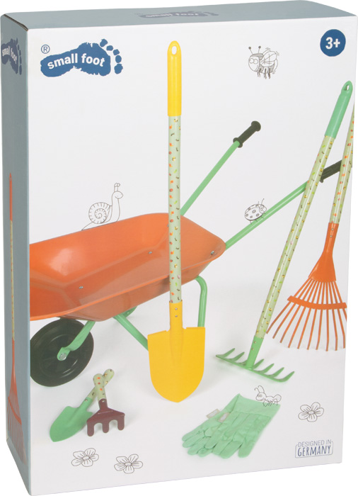 - Comprehensive garden set with a wheelbarrow, three large tools (rakes, spade) and two small hand tools (trowel, hand rake)