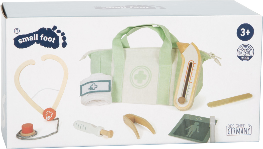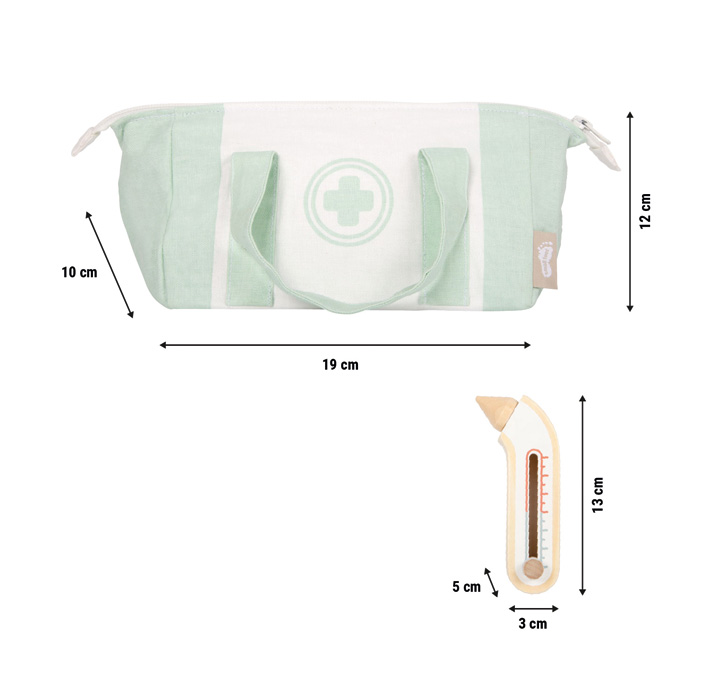 Per piccoli dottori con grande stile! Questa borsa da dottore contiene 9 strumenti medici in legno accuratamente selezionati e trasportabili in una robusta borsa di stoffa con cerniera e pratici manici. All'interno ci sono uno stetoscopio, una siringa che si ritrae automaticamente, un termometro con display regolabile, una pinzetta, una spatola, una benda con chiusura a velcro e una cartella clinica con pennarello per scriverci sopra. Un kit perfetto per giocare a fare il dottore a casa o in viaggio. Il kit è stato realizzato con materiali di qualità, vanta graziosi dettagli e ha un elevato valore educativo.