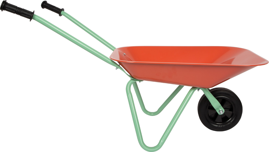 • Set completo con carriola, 3 attrezzi grandi (rastrello, pala, scopa per foglie) e due attrezzi piccoli (paletta, rastrellino)