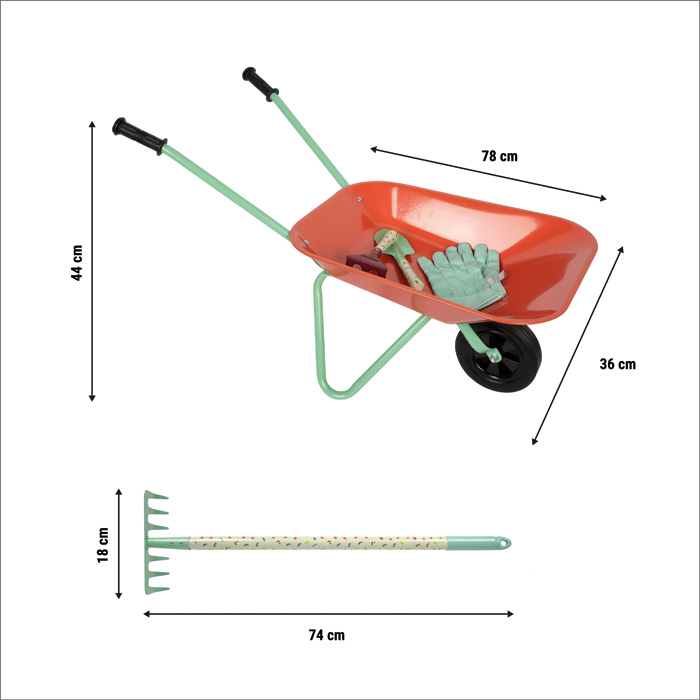 Dimensioni: Carriola ca. 78 x 36 x 44 cm, altezza manico ca. 44 cm, carico massimo 15 kg, rastrello ca. 74 x 18 x 8 cm