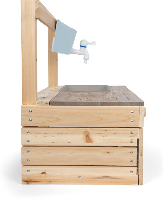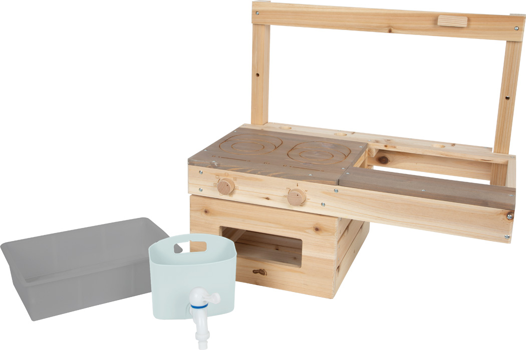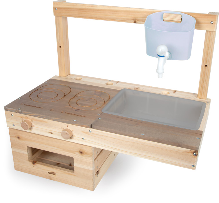 Una soluzione intelligente per "cucinare" in giardino occupando poco spazio! Questa variante occupa poco spazio, può essere usata come cucina appesa, cucinetta compatta o angolo cottura in giardino, adattandosi perfettamente a giardini più piccoli, terrazze o aree esterne. Può essere appesa a una torre da arrampicata, a una casetta da giardino o al muro. Questa cucinetta vanta fornelli con comandi "touch" incisi, un forno con 2 manopole, un distributore d'acqua sospeso con rubinetto e lavandino, nonché un piano da lavoro con vernice grigia idrorepellente. Inoltre, è dotata di appositi spazi in cui riporre bastoncini, cucchiai, ecc.