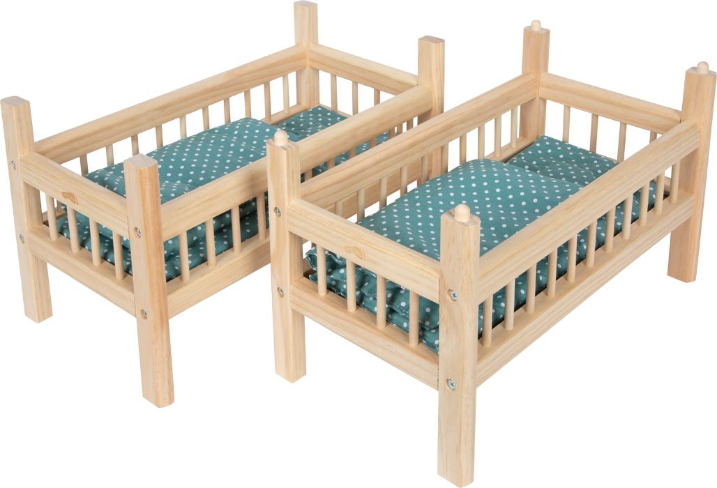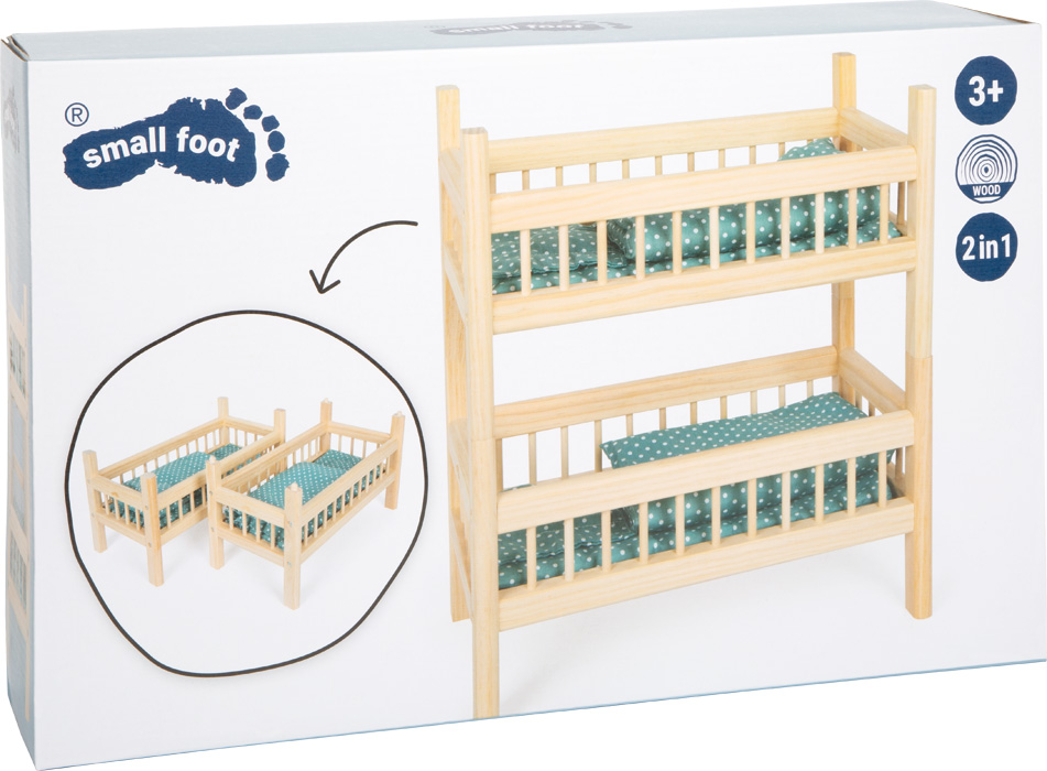 È l'ora della nanna per bambole e peluche! Questo letto per le bambole in robusto legno naturale è utilizzabile in due versioni, ;o come due letti singoli o come letto a castello per occupare meno spazio. Grazie agli angoli arrotondati, alla lavorazione pregiata e a dimensioni adatte a bambole e peluche fino a 39 cm, questo letto è la soluzione ideale per i piccoli genitori delle bambole. Sono incluse anche delle morbide lenzuola composte da coperta gigante, cuscino e lenzuolo. Per notti da sogno in cameretta!