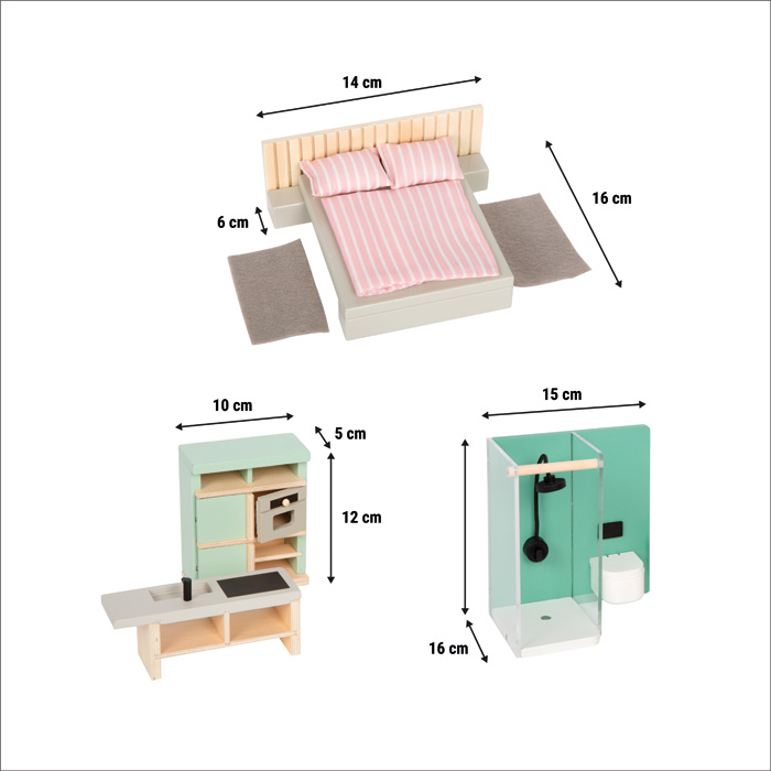 Un design scandinavo per la casa delle bambole! Questo dettagliato set di mobili offre un arredamento completo per tutte le stanze, caratterizzato da uno stile moderno, colori tenui e un'alta percentuale di legno. Sono inclusi mobili per ogni stanza: un letto matrimoniale con una grande coperta, due cuscini e tappetini invitano a fare dolci sogni in camera da letto. Il bagno si contraddistingue per le sue rubinetterie nere e i dettagli moderni, come una doccia a pioggia regolabile con cabina in vetro acrilico, un tappetino, un gabinetto con copriwater e un elegante lavandino da appoggio con mensola e portasciugamani. La cucina è funzionale ed estetica al tempo stesso e vanta un'isola con piano cottura e lavandino, nonché un mobile alto con frigorifero e forno. Un grande tavolo, due panche e morbidi cuscini creano un'atmosfera invitante in sala da pranzo. Infine, un confortevole soggiorno con divano, cuscini, tappeto, pianta, tavolino e lampada ad arco. Tutti i mobili sono adatti a bambole pieghevoli di massimo 12 cm: perfetti per piccoli mondi ricchi di stile!