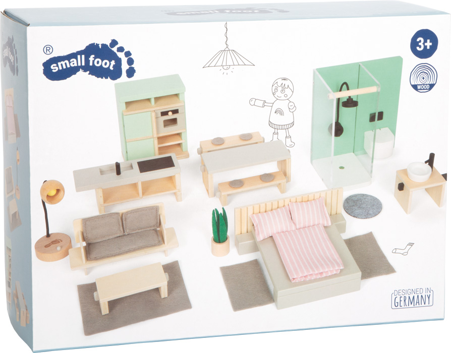 Un arredamento moderno per la casa delle bambole: l'armonia dei colori dalle tonalità tenui, in combinazione con superfici in legno naturale, conferisce a questo set di mobili un tocco particolarmente confortevole, all'insegna dello stile minimalista hygge. Si tratta di un'aggiunta perfetta alla casa delle bambole, perché questo set stimola la fantasia e offre innumerevoli possibilità per giochi di ruolo che hanno a che fare con la quotidianità casalinga. La lavorazione pregiata permette di utilizzare questo prodotto a lungo, garantendo un divertimento a lungo termine.