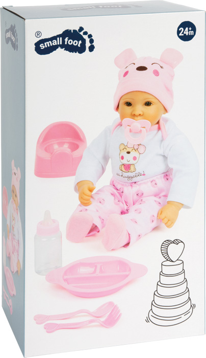 Contenuto: 1 bambola, 1 camicia a maniche lunghe, 1 paio di pantaloni, 1 paio di calzini, 1 berretto, 1 ciuccio, 2 posate, 1 piatto, 1 bottiglia, 1 vasino
