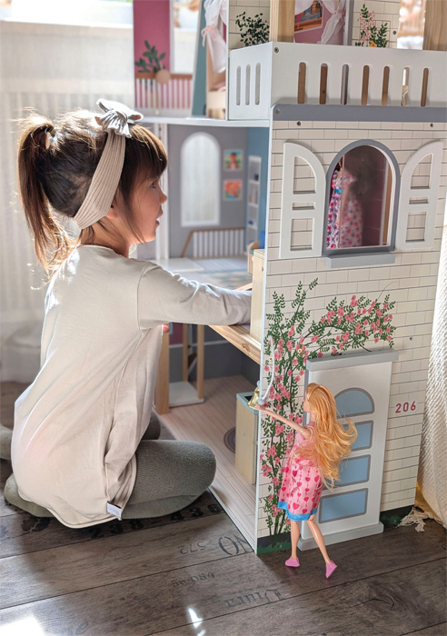 Grazie alla parte frontale aperta, la casa per le bambole è perfetta per il gioco: possono usarla anche più bambini contemporaneamente. Arredare, cambiare lo stile, inventare storie: nella casa delle bambole inizia l'aventura di gioco, dove nessun giorno è uguale a quello prima. La villa da sogno è un luogo nel quale fiorisce la creatività. Allo stesso tempo, grazie al gioco libero si promuovono competenze motorie, linguistiche e sociali.