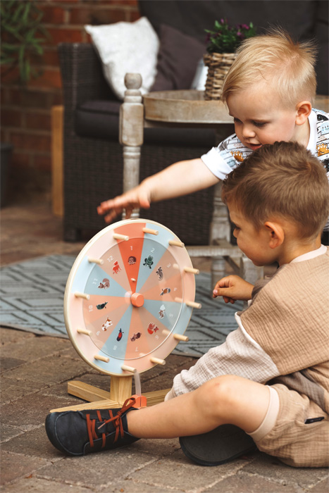 Divertirsi ancor di più con scoiattoli, ricci, uccelli, topi, rane, cani, gatti e conigli! Grazie ai due sfondi in plexiglas personalizzabili e interscambiabili, la ruota della fortuna - realizzata in legno pregiato e dal design robusto - è adatta a ogni tipo di gioco. In famiglia, all'asilo o ad una festa di compleanno, la ruota della fortuna offre sempre sfide divertenti e, grazie alla combinazione di colori neutri e al design accattivante, è adatta a tutte le età. Un giocattolo semplice da utilizzare e personalizzabile, perfetto per ogni occasione.