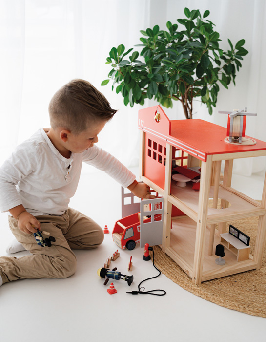 Che si tratti di ua missione in un grattacielo, di un incendio nel parco o del salvataggio con elicottero, con questo set da gioco dei vigili del fuoco completamente attrezzato i piccoli pompieri possono entrare subito in azione! Un set da gioco ben studiato, che combina azione e fantasia in un design sostenibile.
